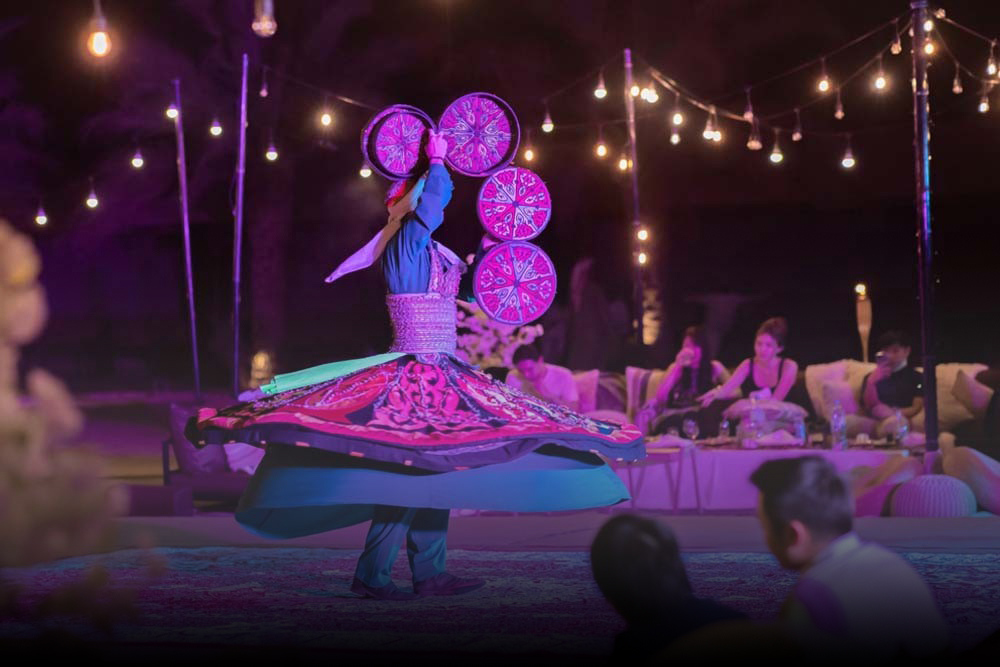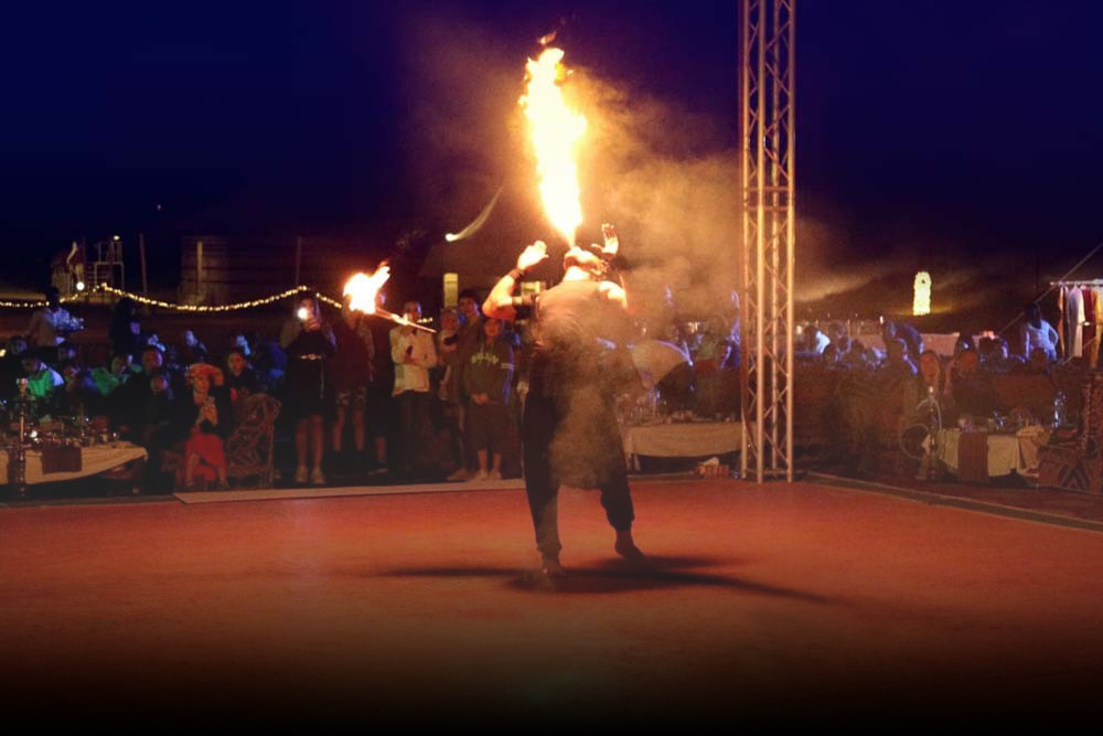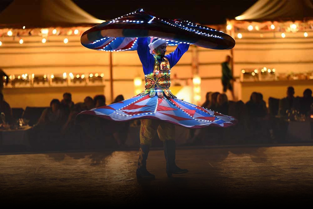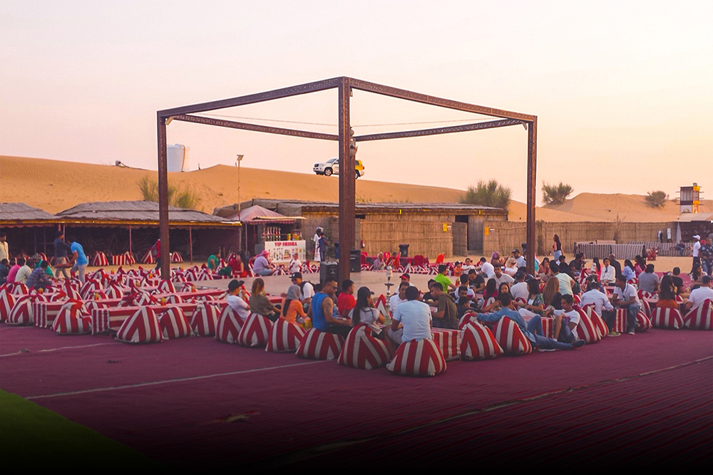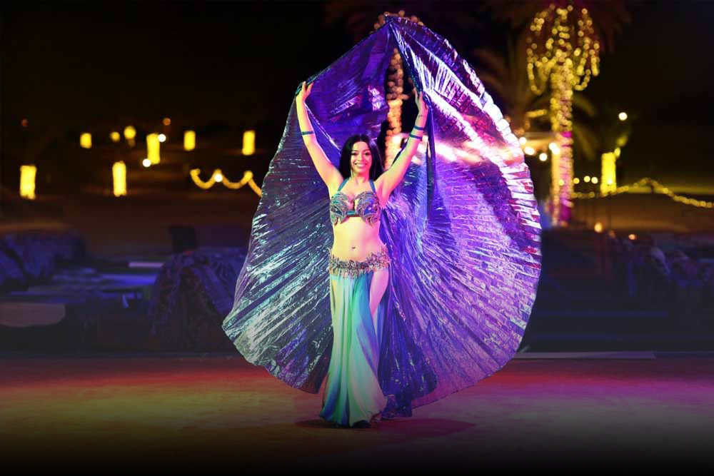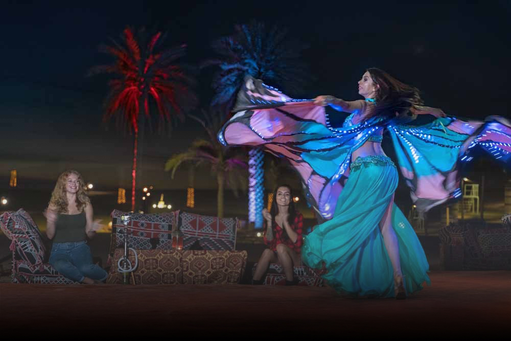 Indulge in a traditional welcome with Arabic refreshments, including Loqumat, Falafel, Dates & Coffee, before settling in for an evening of entertainment. Enjoy live performances featuring belly dance, Tanora dance, and a mesmerizing fire show under the starlit sky, adding to the ambiance of the desert oasis.