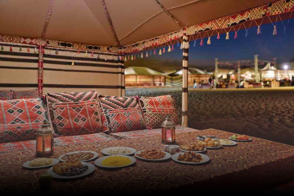 Indulge in a traditional welcome with Arabic refreshments, including Loqumat, Falafel, Dates & Coffee, before settling in for an evening of entertainment. Enjoy live performances featuring belly dance, Tanora dance, and a mesmerizing fire show under the starlit sky, adding to the ambiance of the desert oasis.